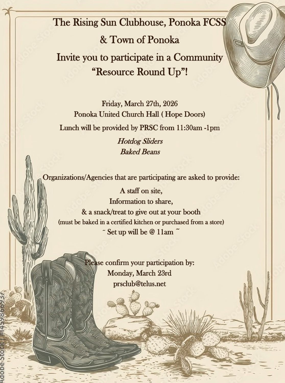 The Rising Sun Clubhouse, Ponoka FCSS & Town of Ponoka Invite your to participate in a Community "Resource Round Up"!