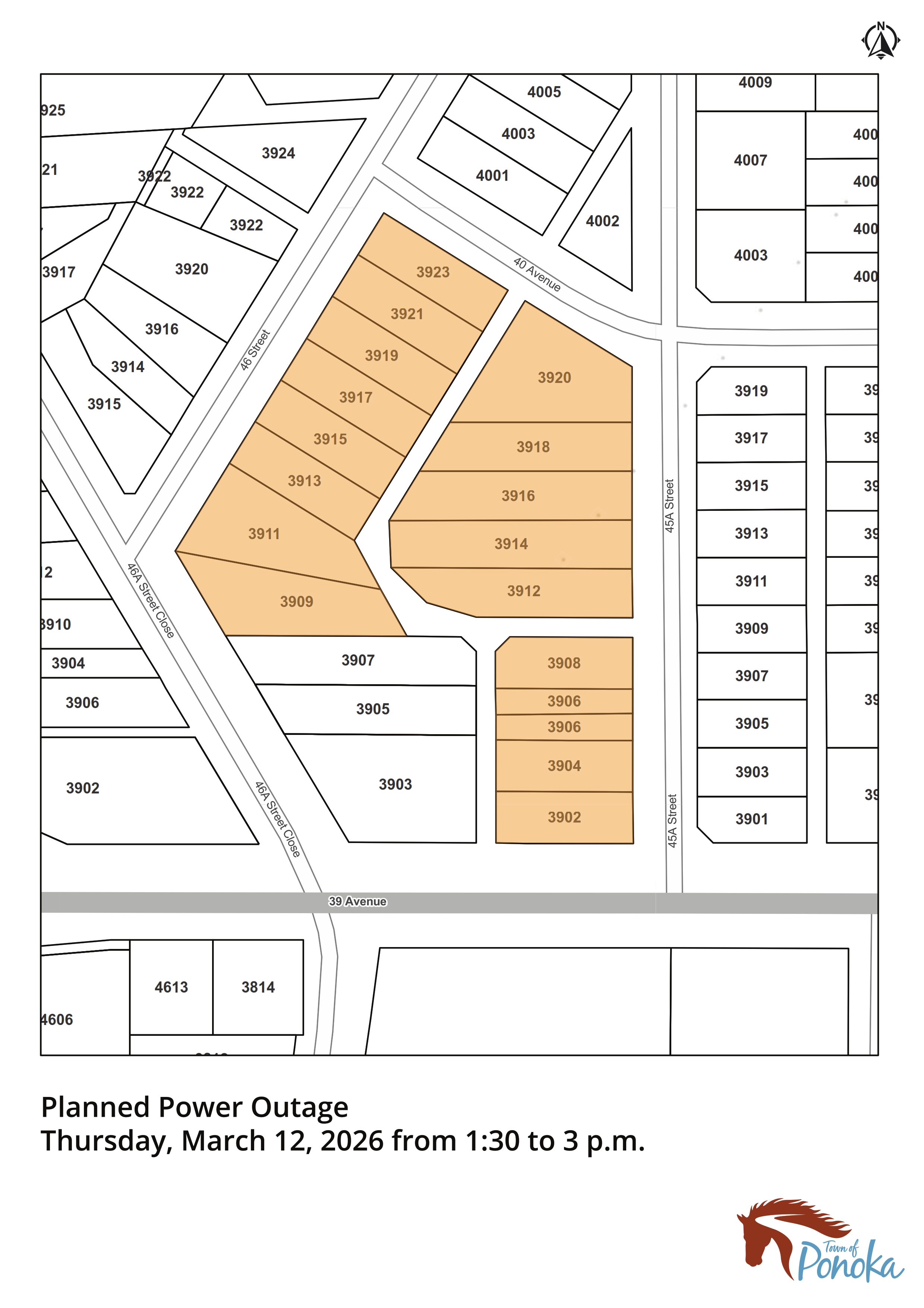 - Properties east of 46 Street and 46A Street Close, between 40 Avenue and Highway 53.